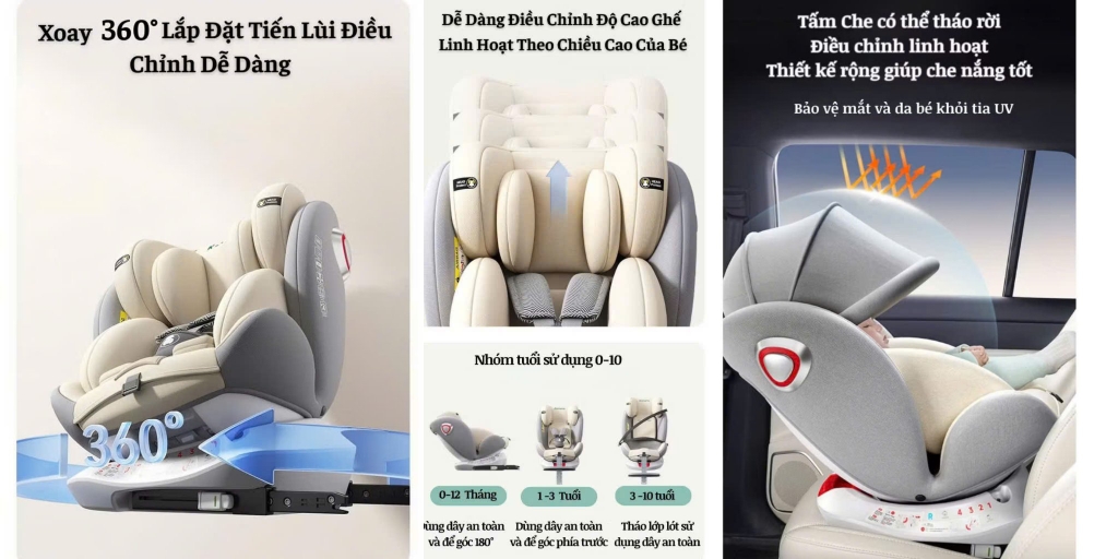 Ngoài ra, nhiều dòng ghế hiện đại còn được trang bị thêm các tiện ích như tấm che nắng chống tia UV, chất liệu vải thoáng khí, chống cháy, giúp bảo vệ làn da và mang lại sự thoải mái cho trẻ trong mọi điều kiện thời tiết.