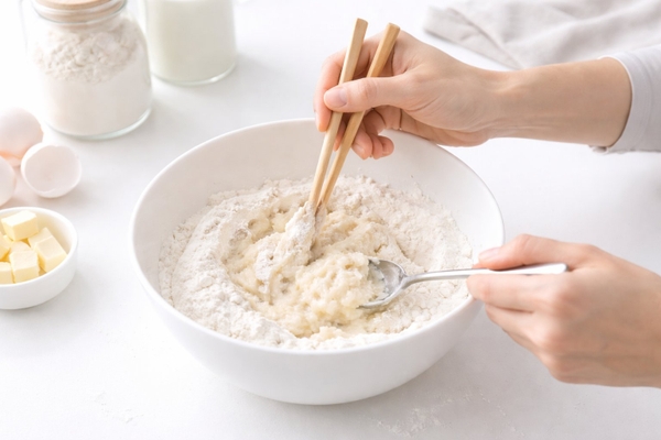 Bước 1: cho đường và muối vào bột trộn đều trước