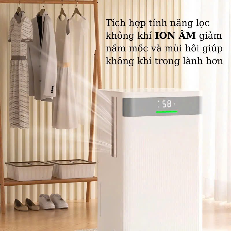 👉 Sấy khô quần áo – khử mùi phòng: Sấy khô quần áo đồng thời khử mùi ẩm mốc của quần áo với cụm ion mật độ cao còn giúp ngăn chặn sự phát triển của vi khuẩn, nấm mốc trong không khí
