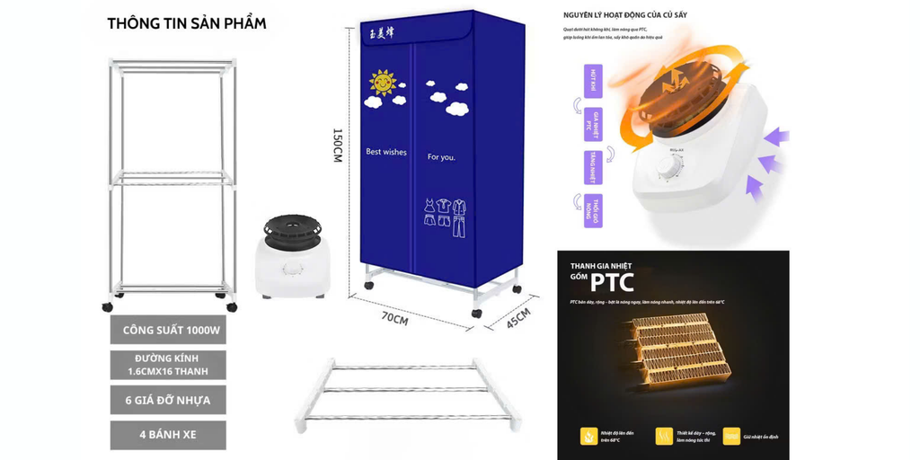 - Về công nghệ, sản phẩm sử dụng hệ thống sấy nóng PTC kết hợp sấy đảo chiều 360 độ, giúp quần áo khô nhanh, không bị ẩm mốc. Ngoài ra, đèn UV và ion âm còn hỗ trợ diệt khuẩn, khử mùi hiệu quả.