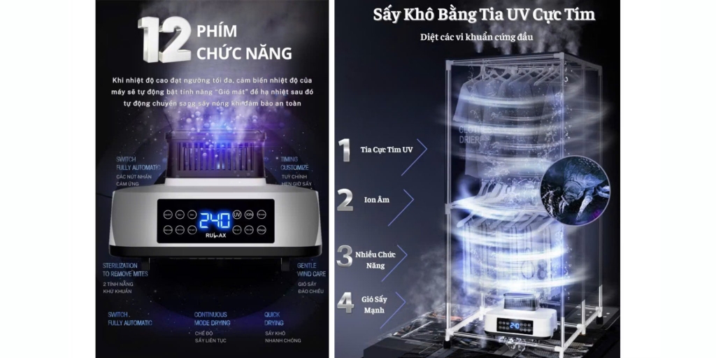 - Bên cạnh đó, các dòng tủ sấy hiện đại còn tích hợp công nghệ diệt khuẩn như đèn UV và ion âm. Nhờ vậy, quần áo sau khi sấy không chỉ khô ráo mà còn sạch khuẩn, khử mùi hiệu quả, đặc biệt phù hợp với gia đình có trẻ nhỏ hoặc người có làn da nhạy cảm.