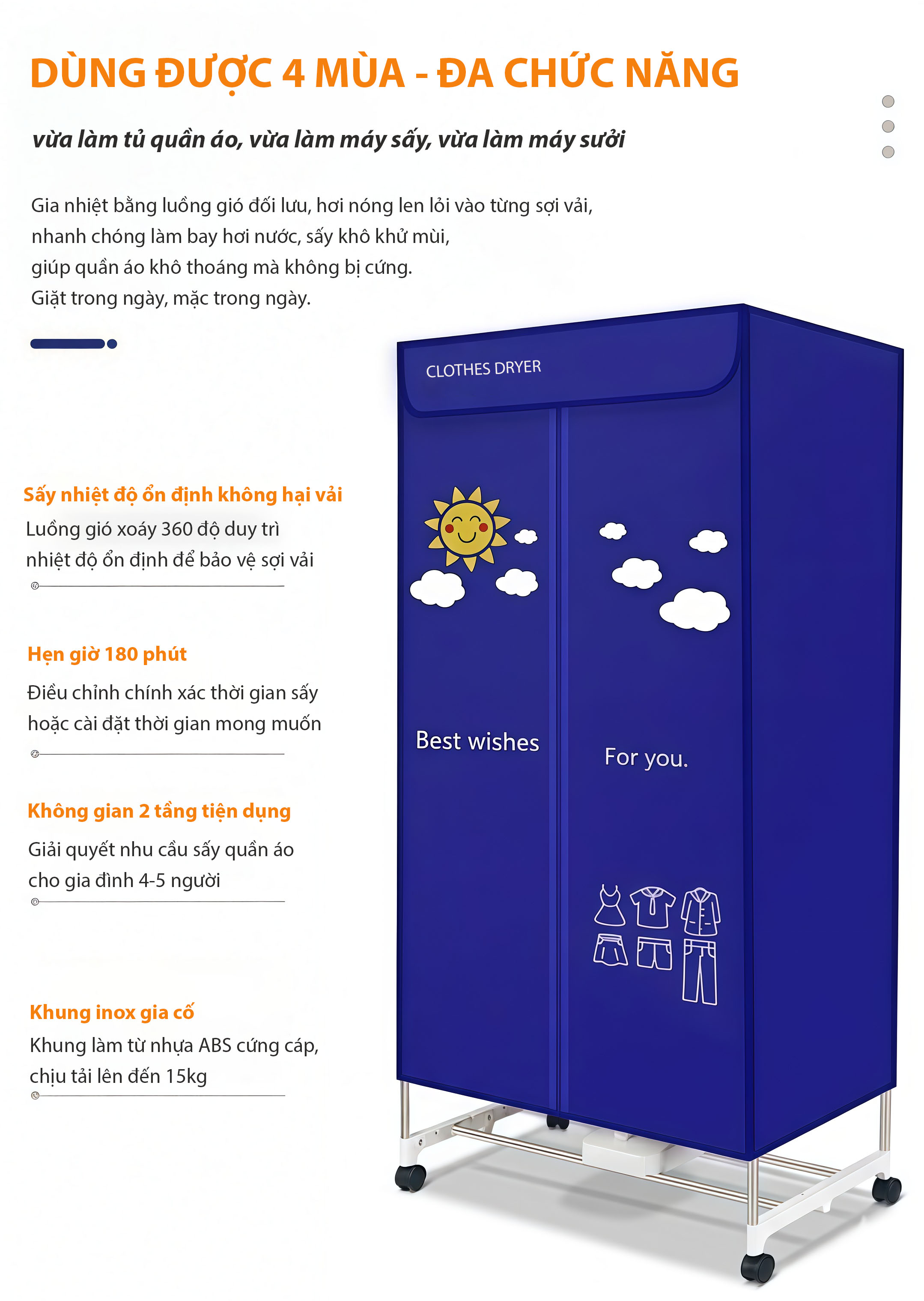 ✅ Thiết kế gọn gàng: Tủ sấy quần áo được lắp thiết kế theo dạng tủ lắp ráp kèm vỏ bọc bên ngoài. Thiết kế này giúp bạn có thể tháo lắp dễ dàng khi không sử dụng đến hoặc tận dụng làm tủ quần áo nếu gia đình bạn có nhiều không gian.